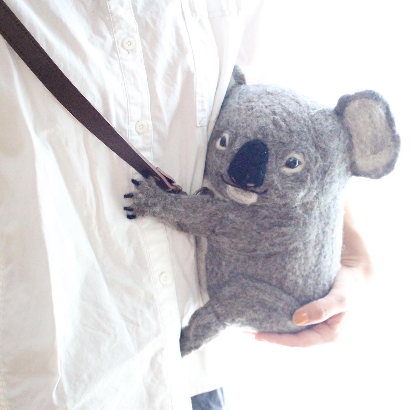 羊毛でをゴシゴシ擦って固めて、コアラを作り、お腹にファスナーをつけてバッグに仕立てています。財布、スマホなどが入れられます。肩から斜めに掛けると、コアラが4本の脚で脇にしがみついてくれます。コアラを小脇に抱えて、お出掛け出来ますよ。