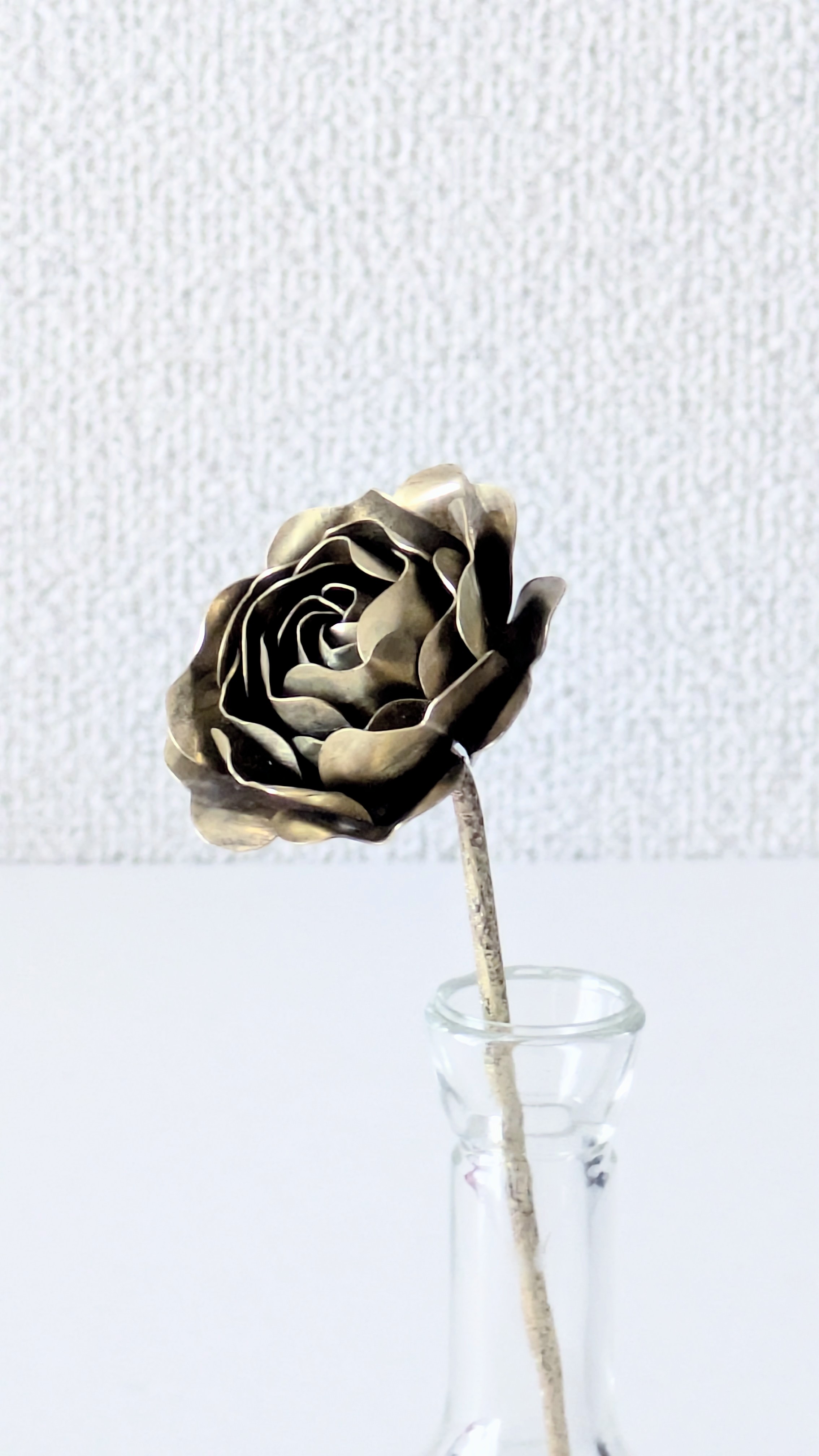 幻想的 きれい板状の金属から花びらを切り出し、溶接して立体的なバラに仕上げています。