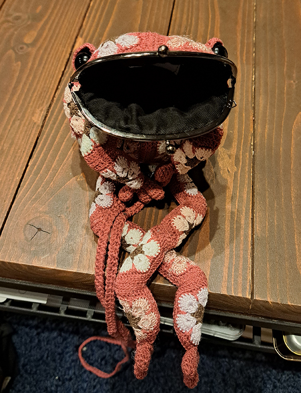 サマーヤーンやレース糸でアフリカンフラワーモチーフをつなぎ合わせ 少しリアルなカエルです あなたの大切なものをお腹中で守ります