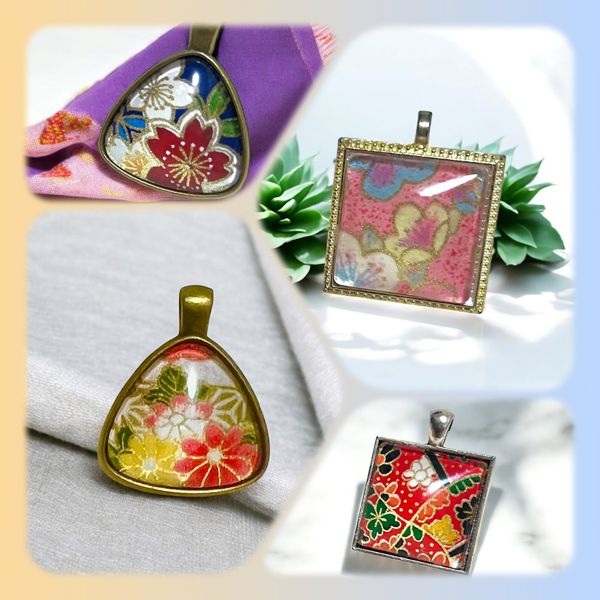 かわいい 幻想的 きれいひと色ひと色手作業で染められた友禅和紙を使ってガラスカボションを作りました。そしてそれらをアクセサリーに仕上げています。金線がガラスの中で浮かび上がるのが魅力的です。柄の切り取り部分が異なるため全て一点ものです。また手作りならではのセットアクセサリーもご覧ください。