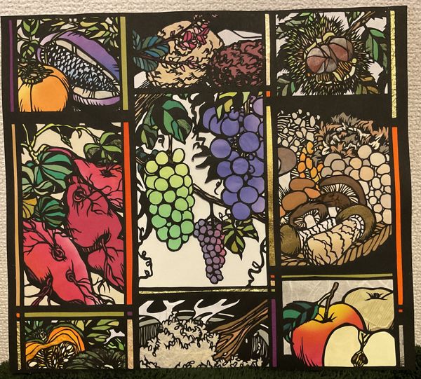 天地がくれた、日本の豊かな秋の実り。季節を問わず様々な農水産物が流通する現代ですが、大地が色づき各地で祭りが催される秋は、人間も自然の一部だと感じさせてくれます。その豊かな地の恵みを、温かさを感じる和紙を使って表現したいと思い、切り絵制作を試みました。