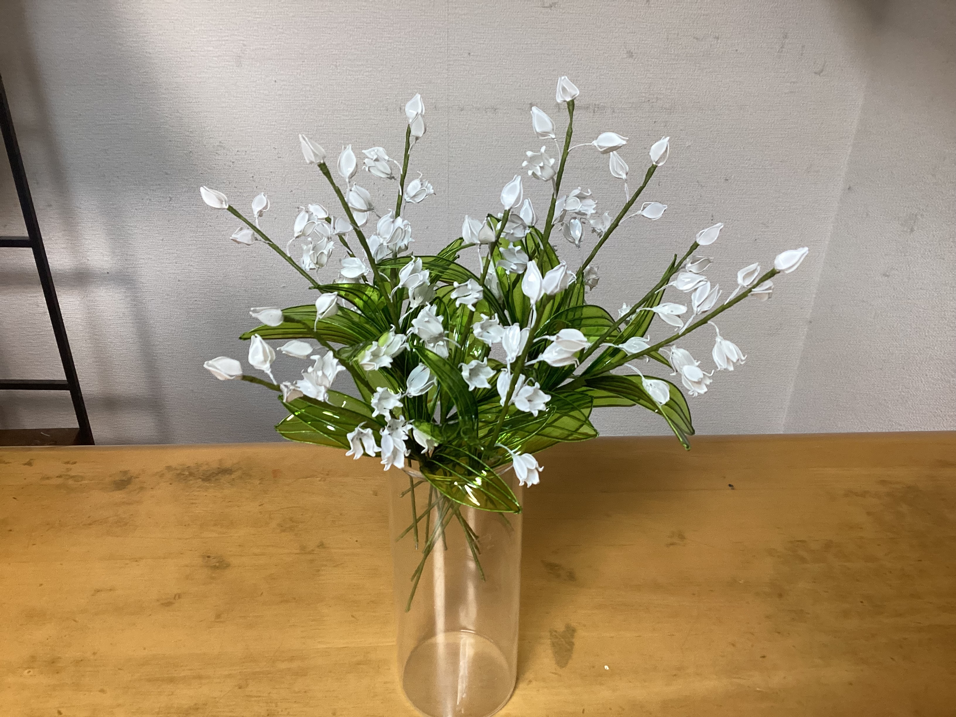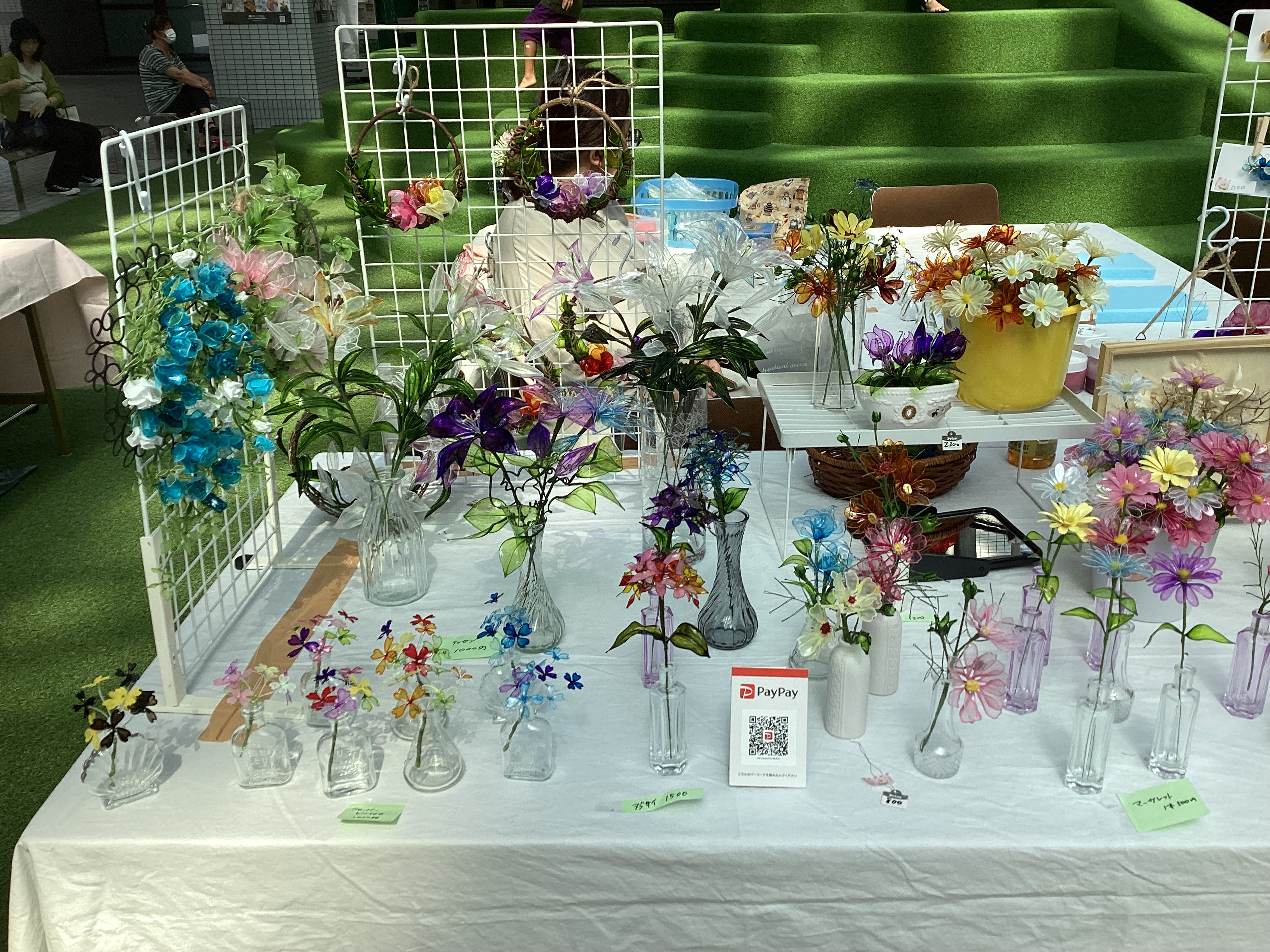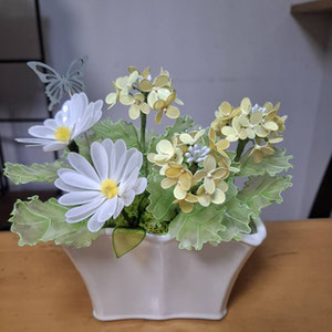 アメリカンフラワーで、季節の花を作っています。透明感があり、軽いお花です。お花とアクセサリーをご用意します。