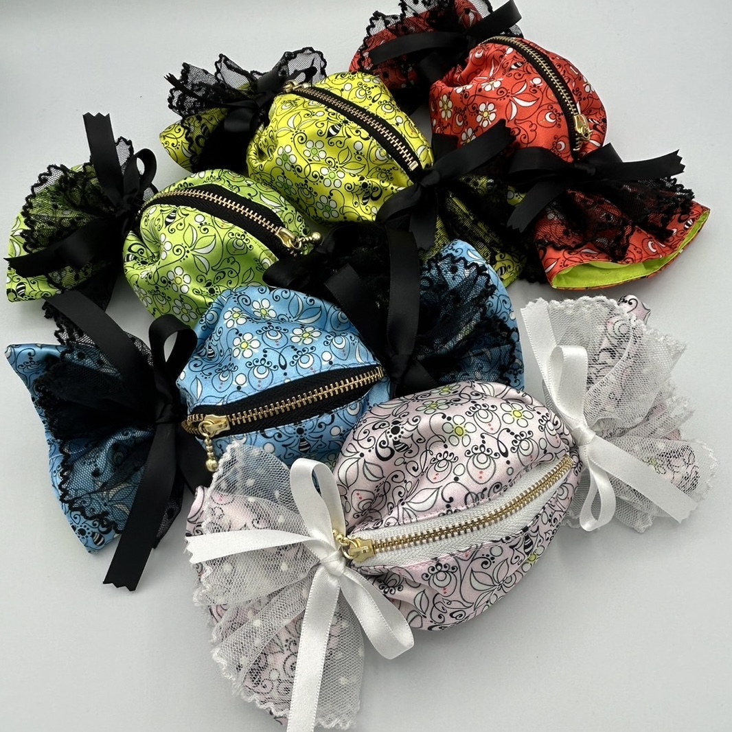 裏地にもドット柄のサテン生地を使い、華やかでありながらポップで楽しい大人可愛いポーチに仕上げました