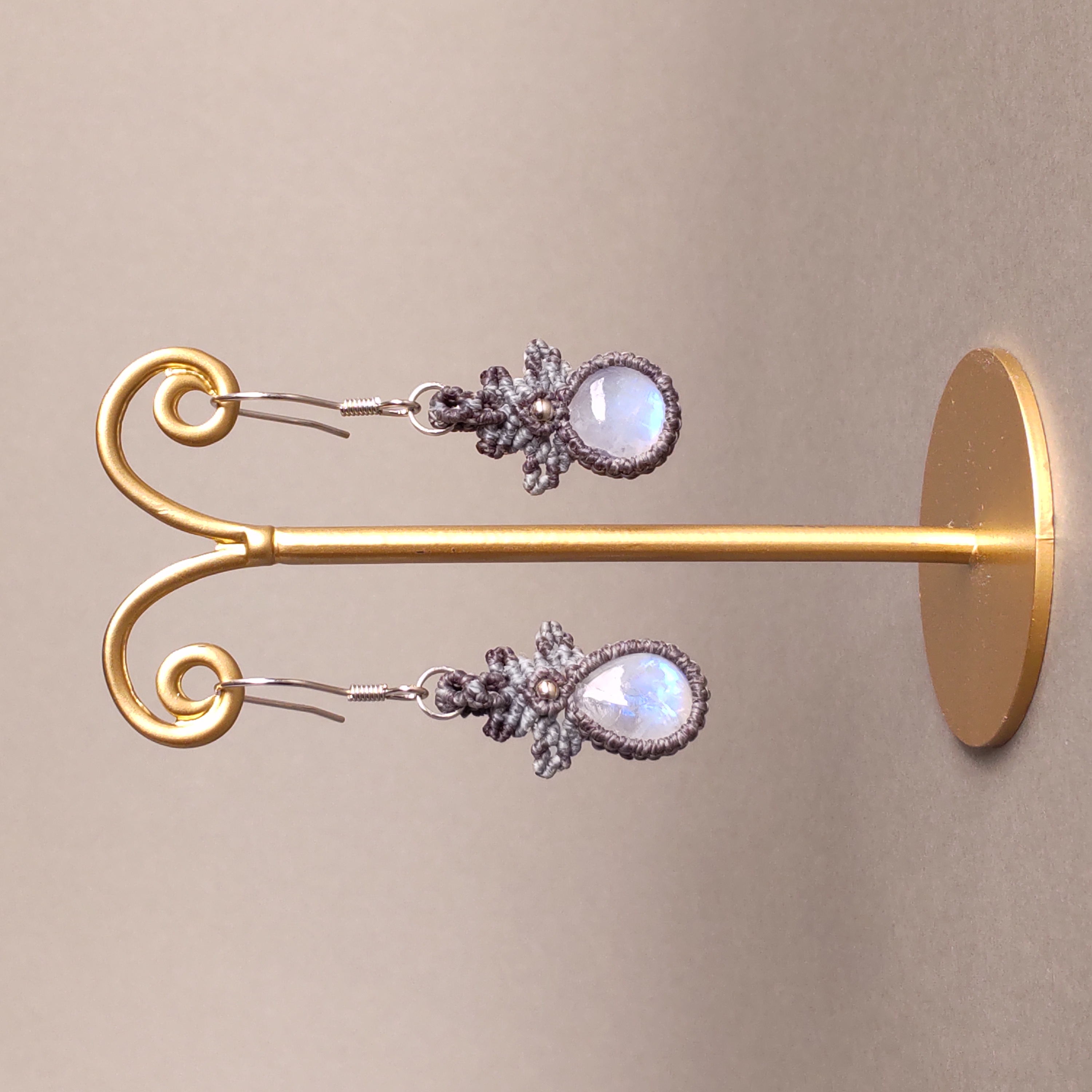 ちっちゃなレインボームーンストーンをブルーグレーのワックスコードで包み、飾り編みには淡いブルーのコードをプラスして、マクラメ編みのピアスを作りました。