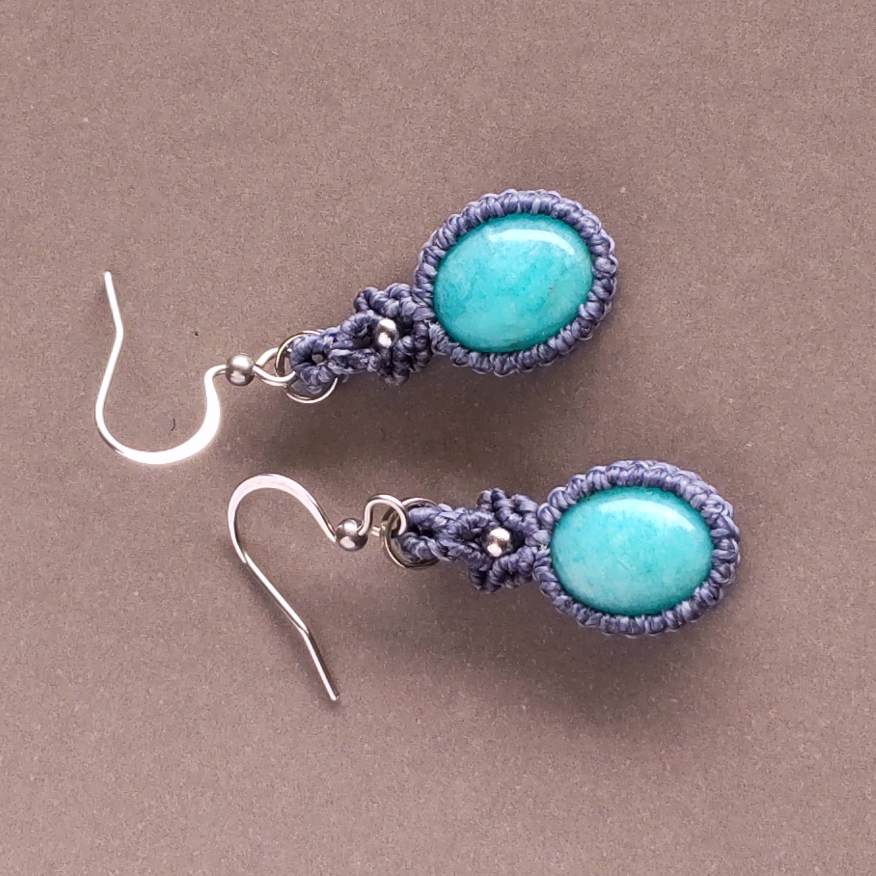 鮮やかなブルーがかわいいアマゾナイトにグレーがかったくすみブルーのワックスコードを合わせてマクラメ編みのピアスを作りました。