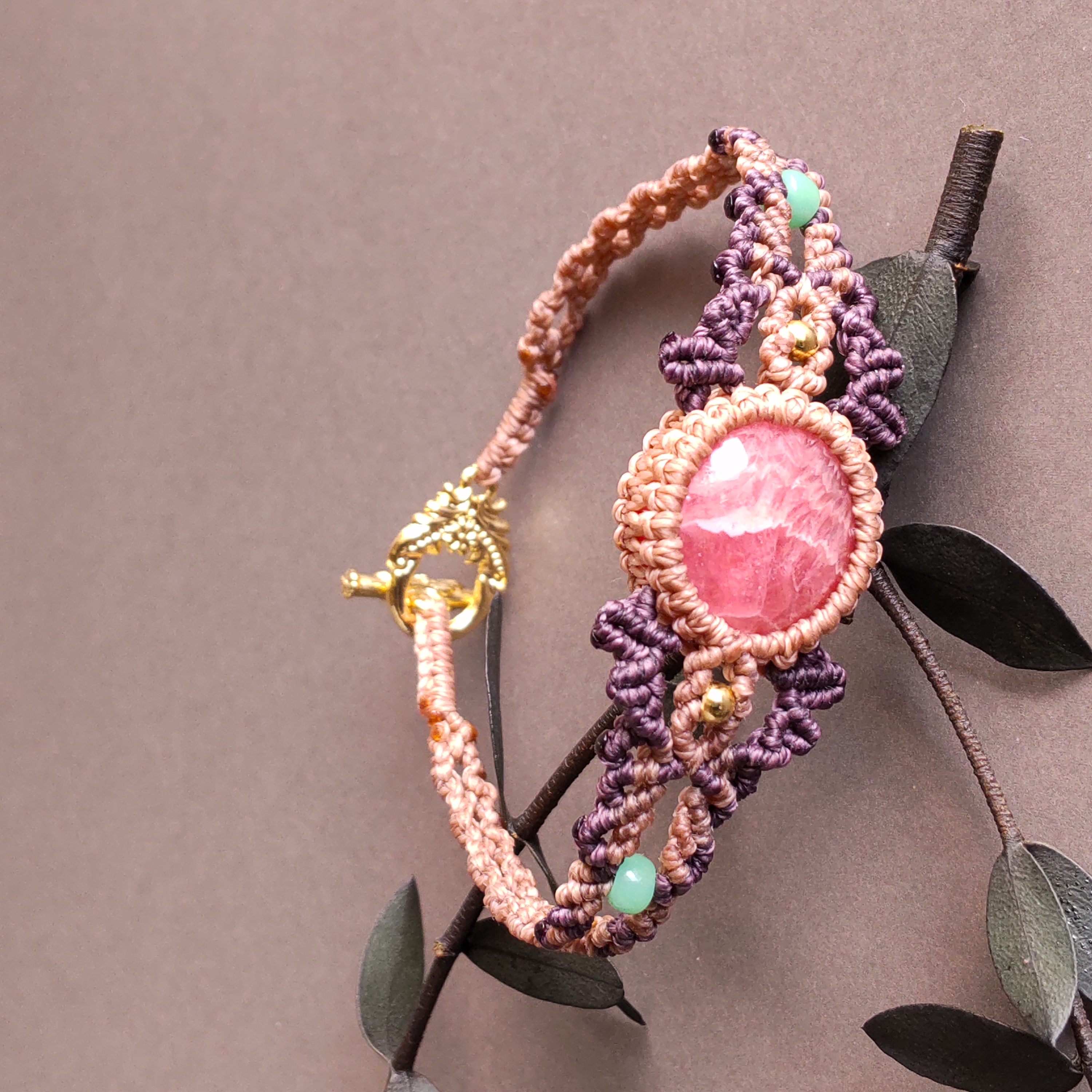 飾り編みの華やかさが特徴的な作品ですが、ロードクロサイトのピンクとナチュラルなアースカラーのブレスレットは、普段使いにぴったりです。