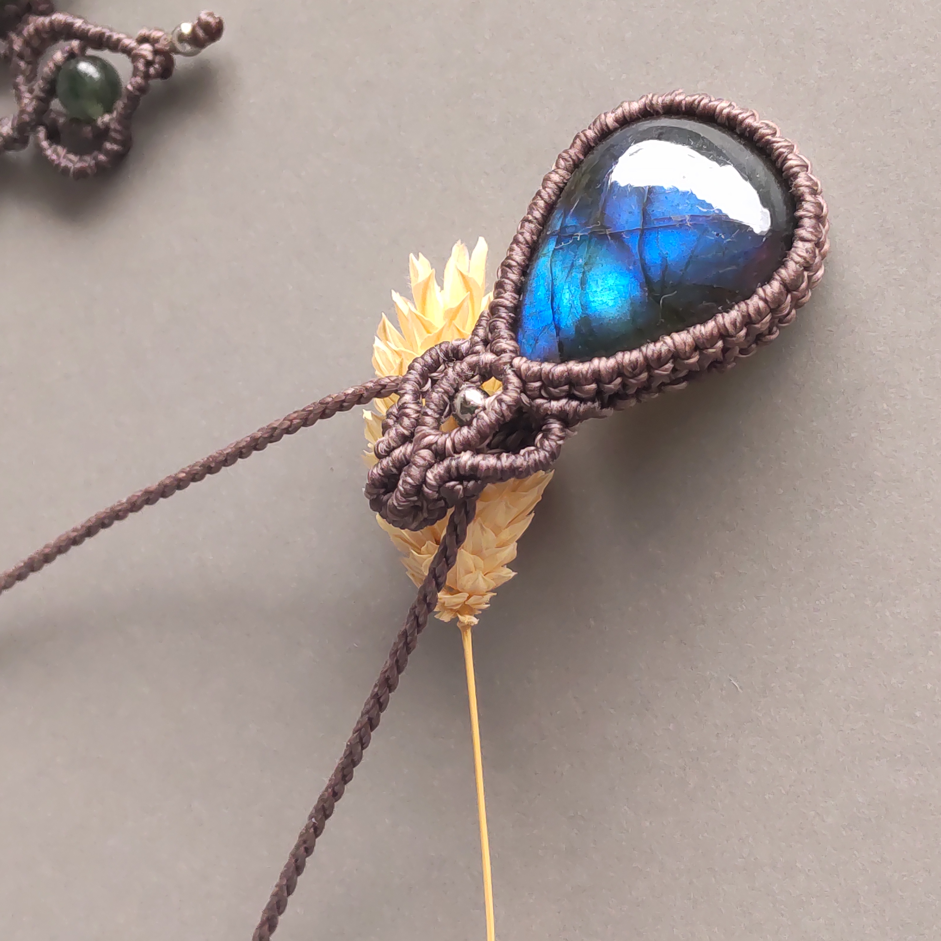 ぽってりとしたしずく型のラブラドライトに、ココアブラウンのワックスコードを合わせてマクラメ編みのネックレスを作りました。