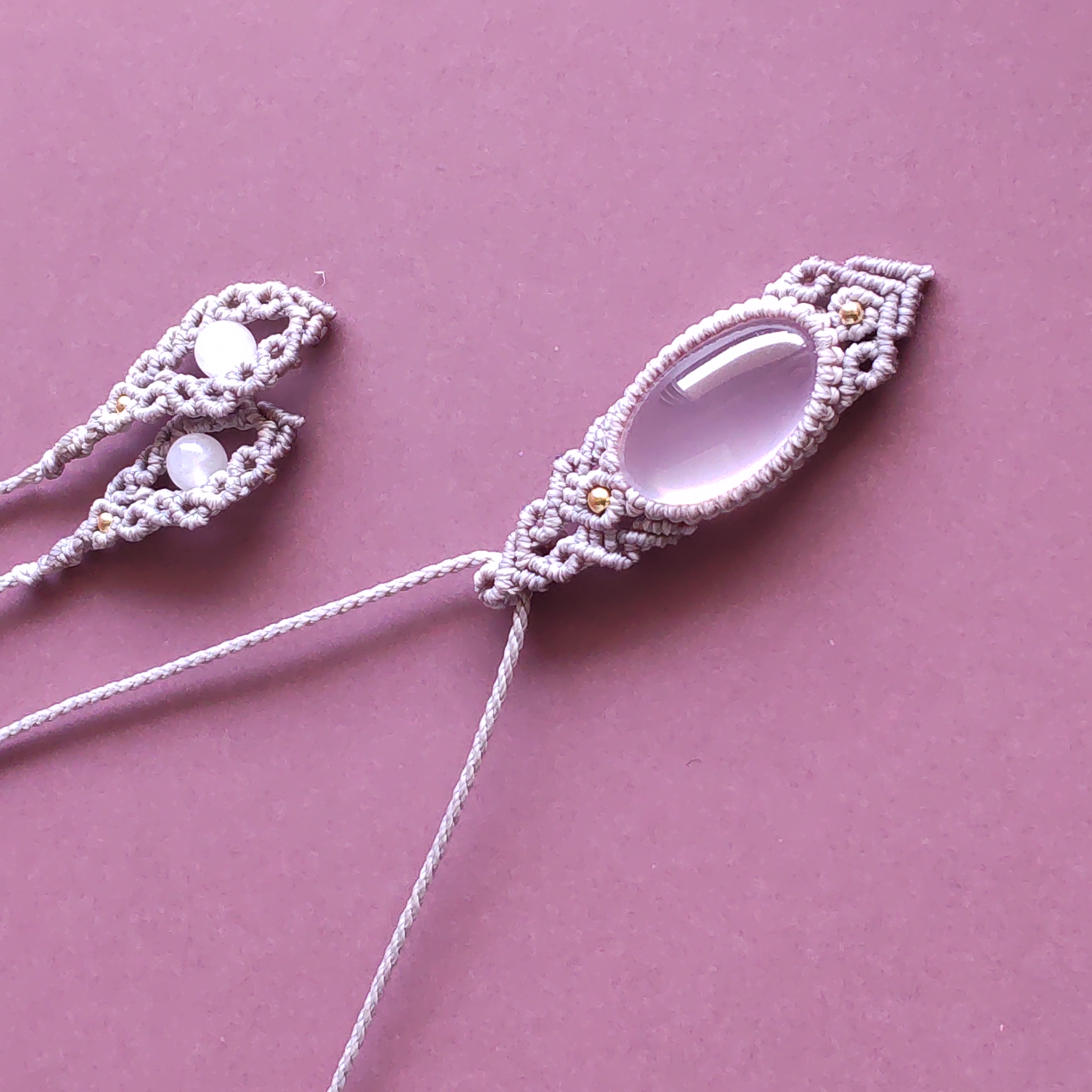 淡いピンクのローズクオーツに淡いグレーのワックスコードを合わせて、マクラメ編みのネックレスを作りました。