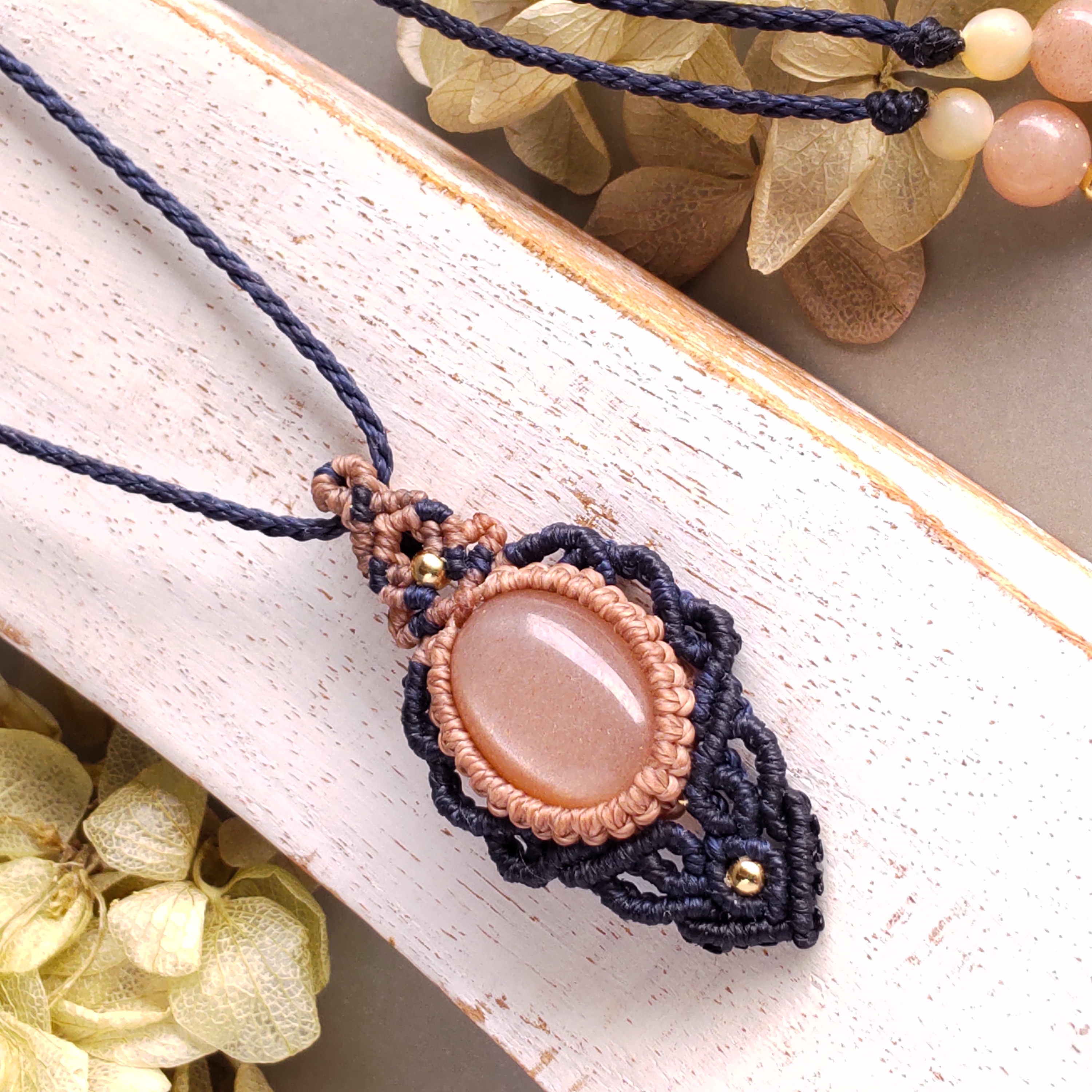 ちょっぴりくすんだオレンジ色のピーチムーンストーンを、明るいベージュのワックスコードで包んで、ネイビーのコードで装飾をつけてマクラメ編みのネックレスを作りました。