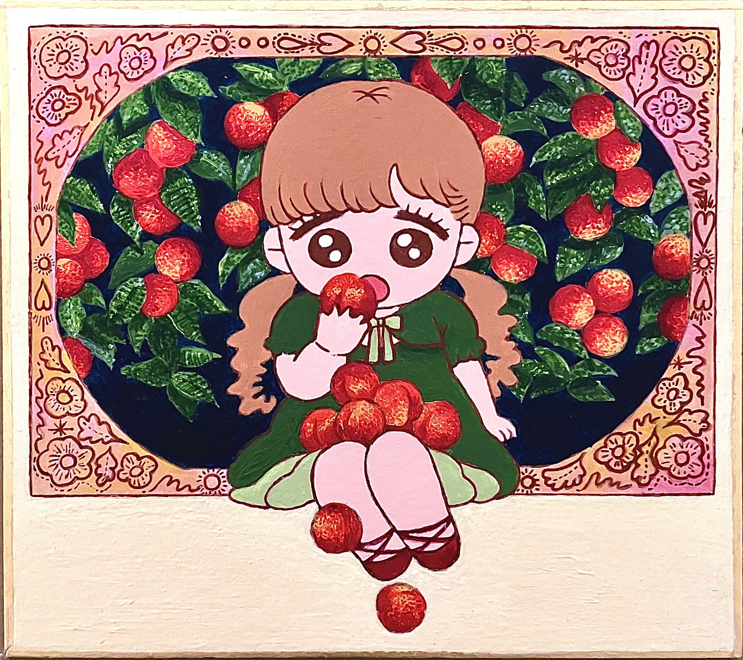 ⚫︎アクリル絵の具や水彩絵の具で丸っこい女の子たちの絵を描いています。